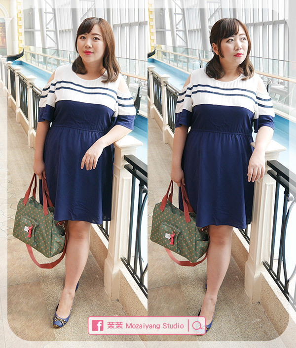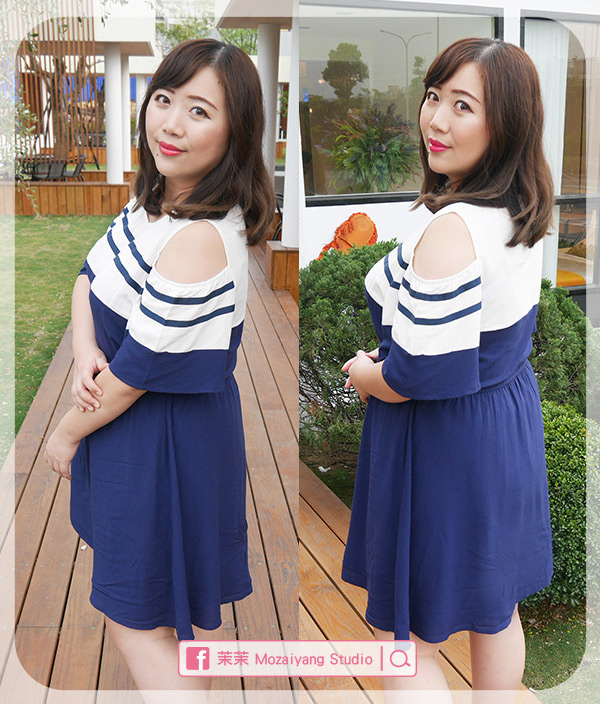 它是挖肩款的連身裙,海軍風的配色非常搶眼,拍照很上鏡,