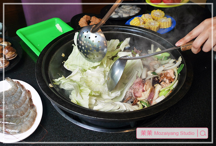 ▼乾炒滿滿一大鍋食材後,就倒入高湯,這樣石頭火鍋鍋底就完成囉!不過不是所有的食材都會下去拌炒,海鮮類及美國安格斯頂級無骨牛小排、頂級西班牙伊比利豬、美國極黑和牛這三盤肉,會留著讓我們自己涮來吃。