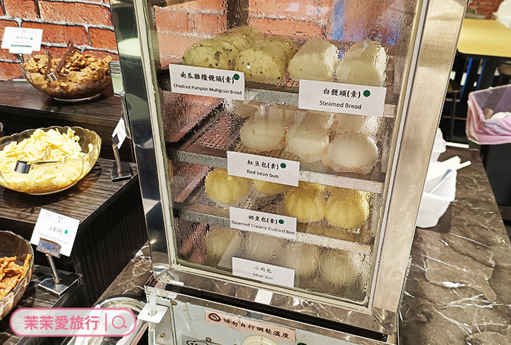 ▼早餐的品項就比較豐盛,除了上述下午茶有的肉燥飯、各類甜品、飲料之外,還有熱炒熟食、清粥小菜、包子饅頭、麵包抹醬、水果。