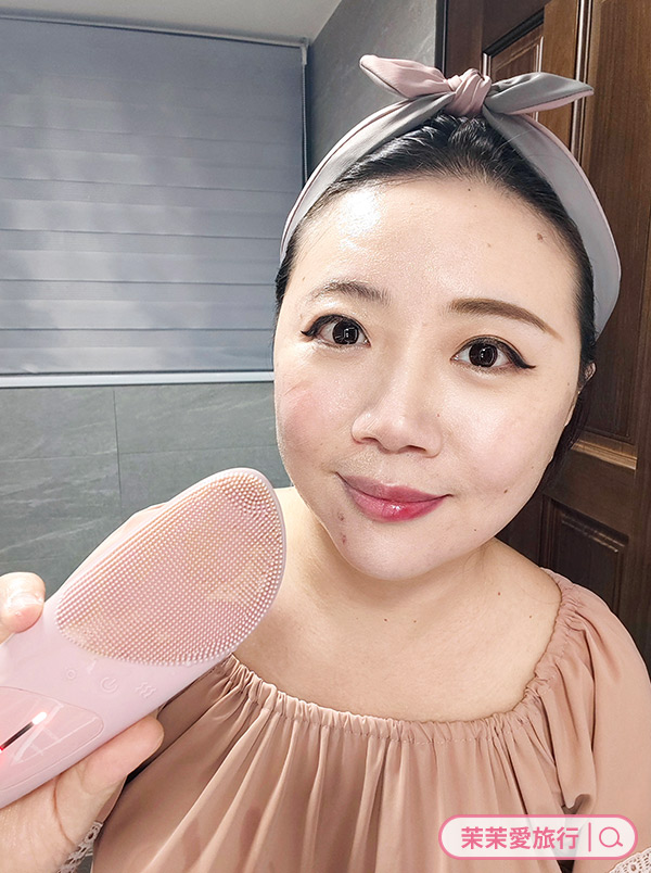 ▼如果是平常素顏洗臉的話,我就用比較小的震動,魔女機 Ultra 溫感柔膚淨透洗臉機 360°多效矽膠立體刷毛+人體工學弧度,全面貼合臉型,鼻翼、邊邊角角都洗得到,連耳後都能洗喔!